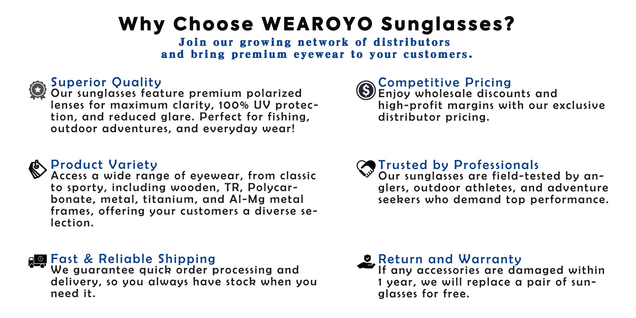 WEAROYO Sunglasses currently supports distributors in the United States, Canada, the United Kingdom, Australia, New Zealand, France, and Germany. We are continuously expanding our reach to serve an even broader customer base.